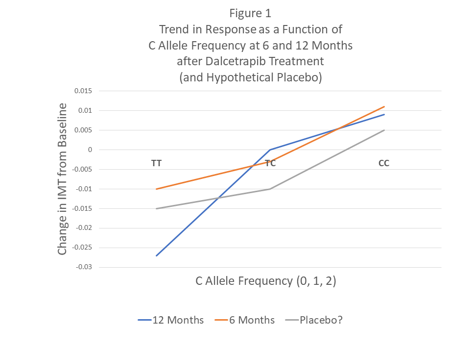 The dal-PLAQUE2 study consisted of 931 patients in a double-blind, randomized, placebo-controlled, parallel group trial designed to evaluate the effect of dalcetrapib on atherosclerotic disease progression in patients with evidence of coronary artery disease and carotid intima-media thickness (IMT). The primary outcome was change from baseline in carotid IMT using ultrasonography at 6 and 12 months. Of the 411 that consented to genetic testing, 386 had imaging measures at baseline, 6 months, and 12 months and were included in the analysis. This was to serve as the “validation” study.