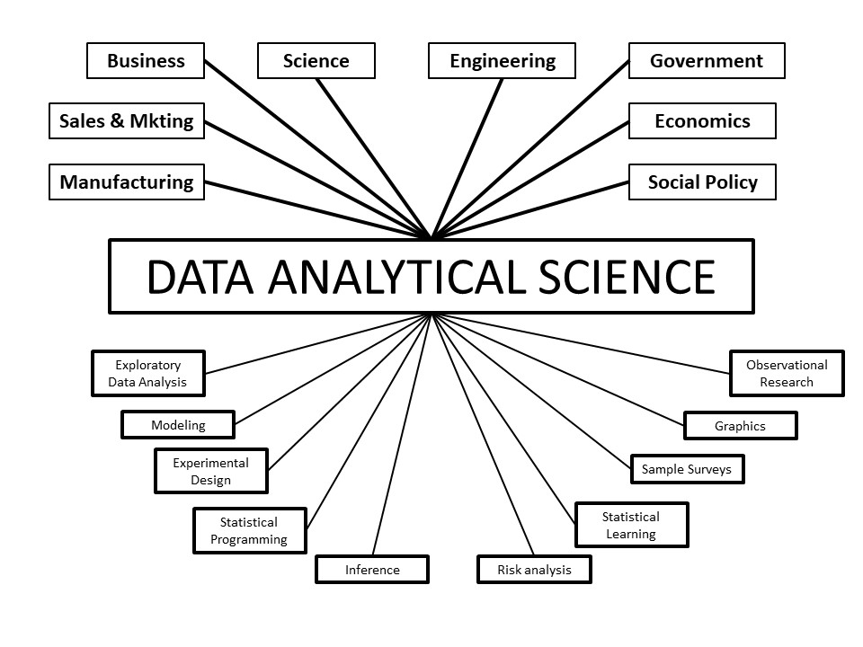 Second, just as with the Medical profession, I prefer to consider one boat called Data Analytical Science, which includes many sub-fields of data analysis (including study design and interpretation of results – e.g. visualizations etc.). That boat is quite large and multi-faceted. It can be used in a vast array of endeavors – in fact, it is hard for me to imagine where Data Analytical Science cannot be applied. When giving a talk to senior management at my former company on the virtues of our company being more analytical and committed to using statistics across the enterprise, I had the following exchange.